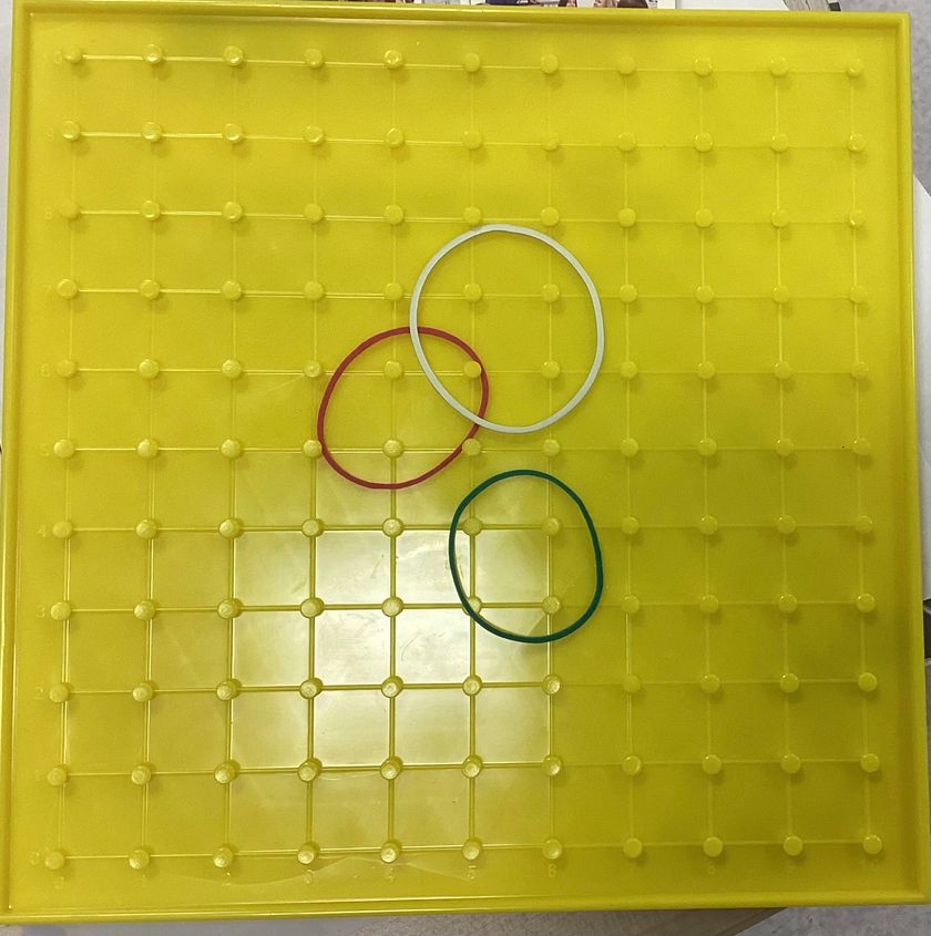 Für diese Aufgabe musst du in den Materialraum gehen und dir ein Geobrett und drei Gummibänder geben lassen.
