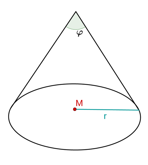 Du benötigst den Radius r und die Höhe h des Kegels. Die Höhe ist direkt gegeben und der Radius ist der halbe Durchmesser: