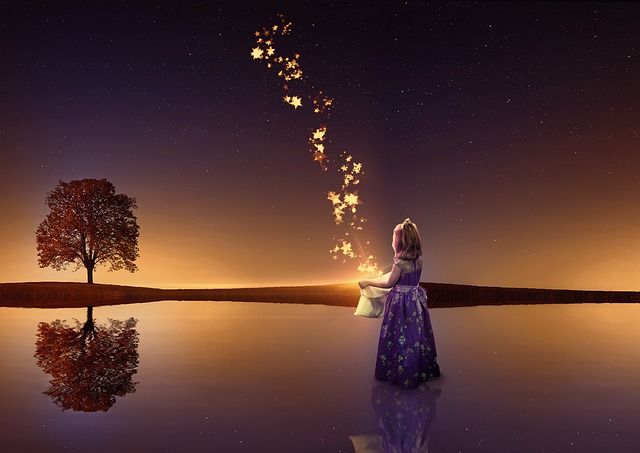 Und wie sie so stand und gar nichts mehr hatte, fielen auf einmal die Sterne vom Himmel, als lauter blanke Taler.