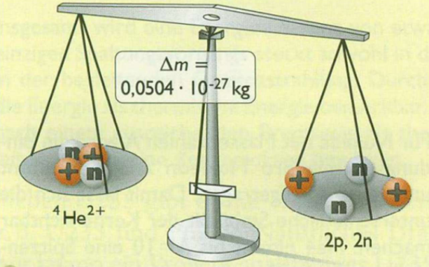 Bestimmt man die Masse eines Atomkerns, welcher aus Z Protonen und N Neutronen besteht und vergleicht dies mit der Summe der Masse der Bestandteile, so stellt man fest, dass der Kern leichter als seine Bestandteile ist. Am einfachsten kann man dies am Heliumkern nachrechnen, die zwei Protonen und die zwei Neutronen sind um 0,0504⋅10−27kg schwerer als der Heliumkern.