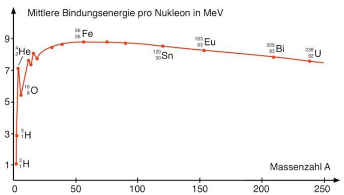 sind dies ca. 7 MeV. In dem Diagramm sind die Bindungsenergien pro Nukleon über der Massenzahl aufgetragen.