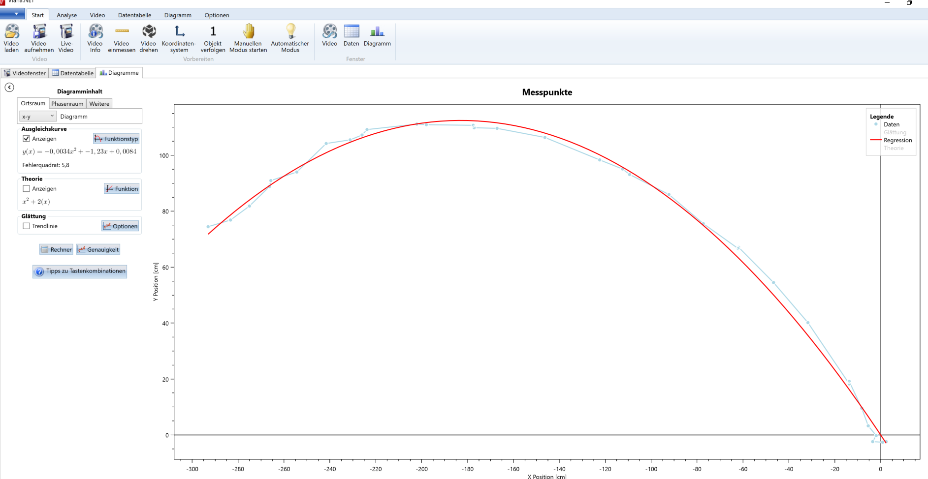 Stellt eure gemessenen Daten in ein Koordinatensystem (z.B. x-y Diagramm) dar. Versucht, die Daten durch eine Parabel zu approximieren (=darzustellen).