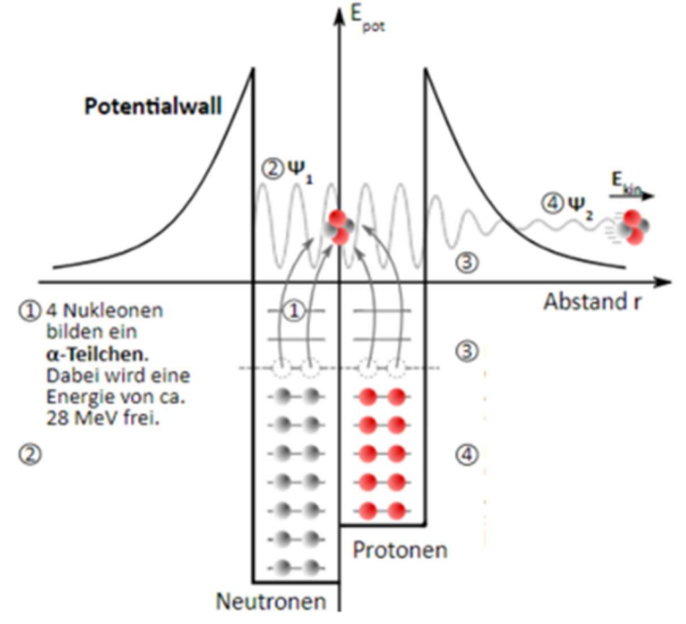 von Quantenobjekten, deren Aufenthaltswahrscheinlichkeiten und den Tunneleffekt. Der Zerfall ist in vier Schritte aufgeteilt. Im ersten Schritt bilden zwei Protonen und zwei Neutronen einen Heliumkern. Dabei wird eine große Menge Energie frei, der Heliumkern kann somit im Potentialtopf weit nach oben springen.