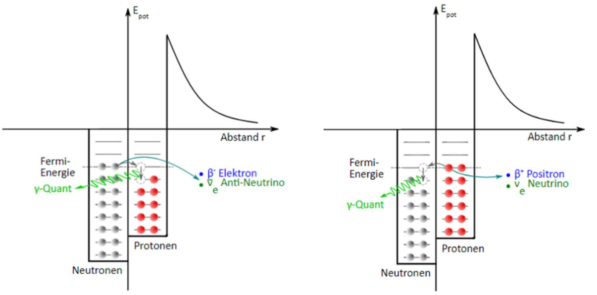 In den beiden Bildern sind der β− und der β+-Zerfall gezeigt.