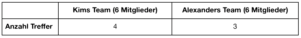 Wel­ches Team hat ge­won­nen? Warum reicht es hier, nur die An­zahl der Tref­fer mit­ein­an­der zu ver­glei­chen? Wieso ist es nicht zwin­gend nötig, die Bal­ken­ta­fel bzw. An­tei­le an Tref­fern zu ver­glei­chen?