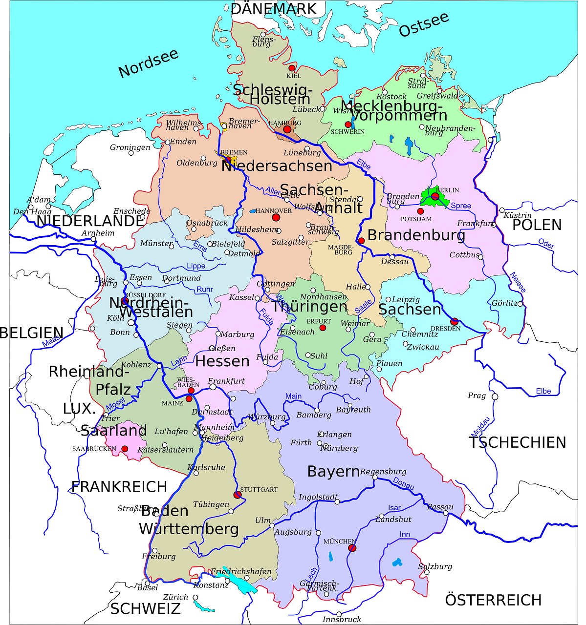 Bundesländer der Bundesrepublik Deutschland. Landeshauptstädte sind mit rotem Punkt markiert.