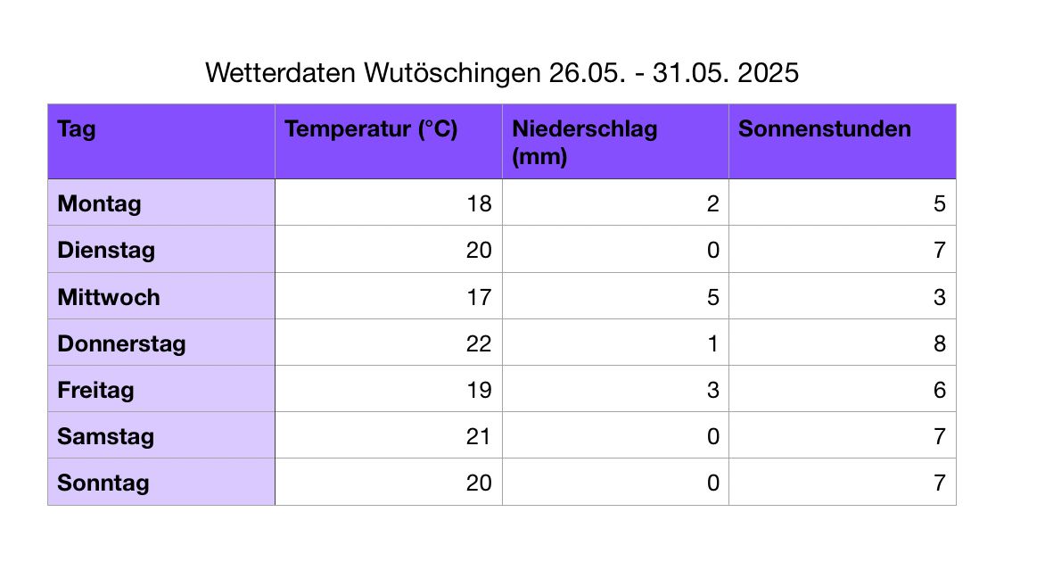 Die Tabelle trägt die Überschrift: „Wetterdaten Wutöschingen 26.05. - 31.05. 2025