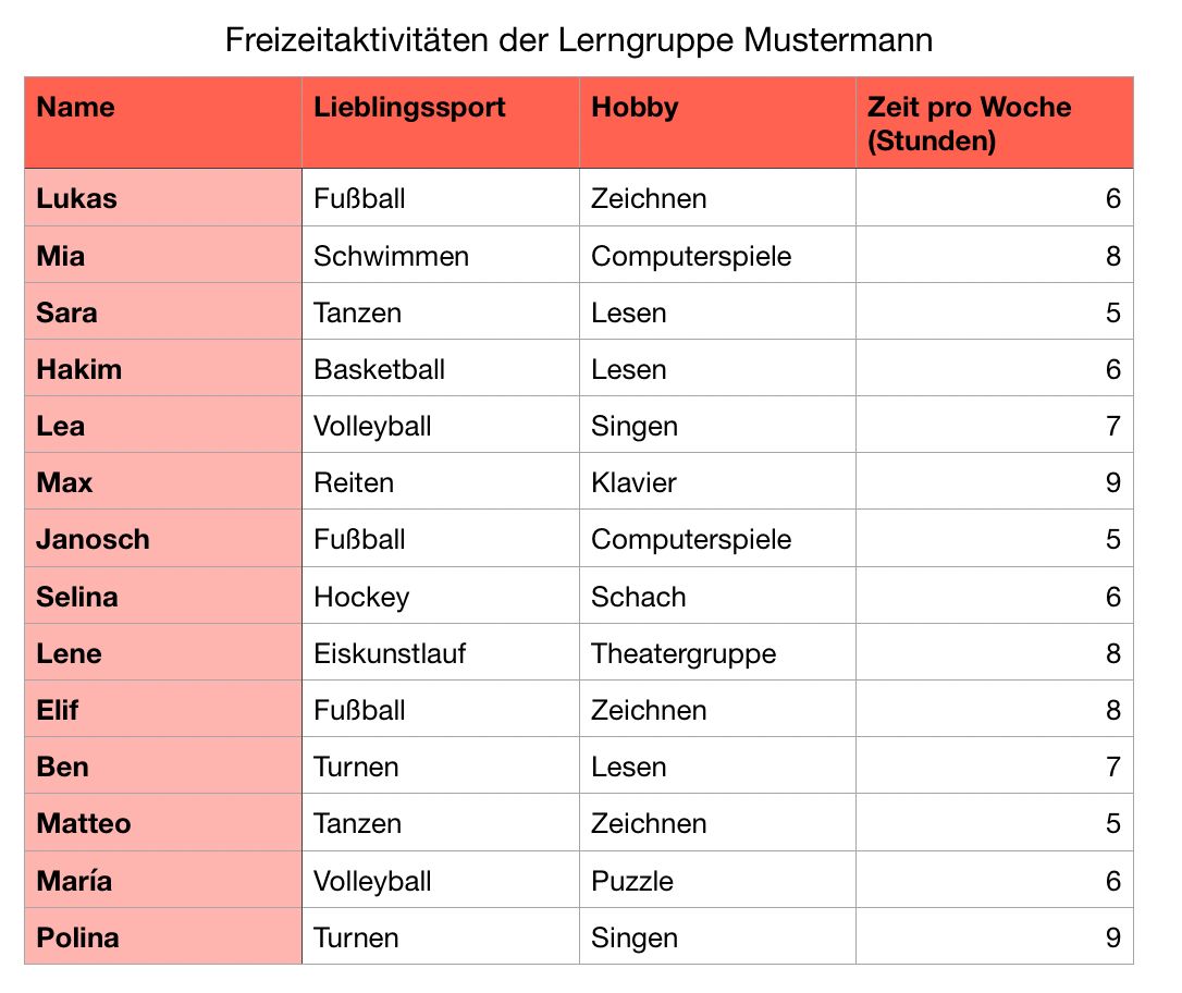 Freizeitaktivitäten der Lerngruppe Mustermann