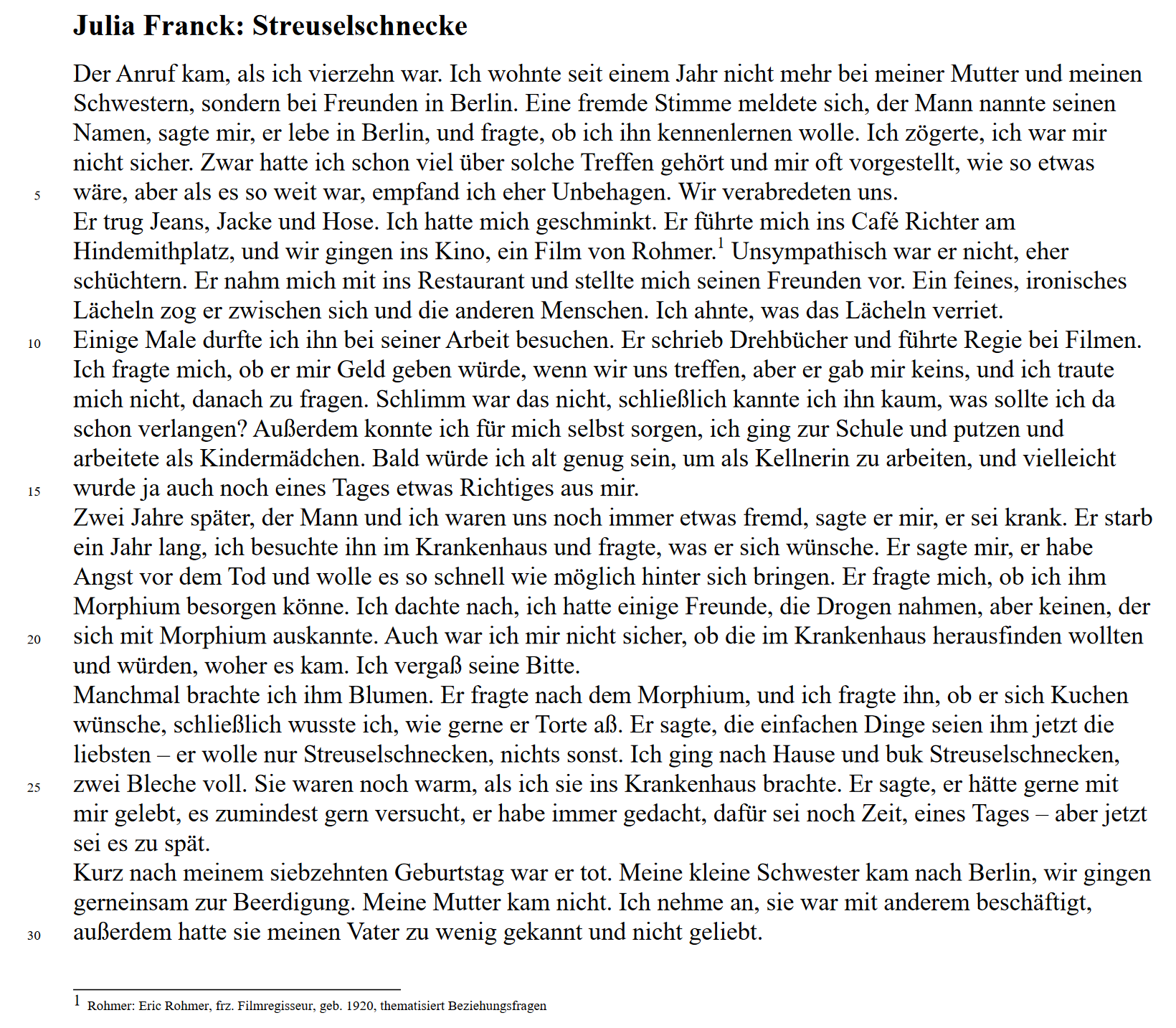 Quelle: Julia Franck: Streuselschnecke, in: Dies.: Bauchlandung: Geschichten zum Anfassen. Fischer Taschenbuch Verlag, Frankfurt am Main, 1. Auflage 2012.